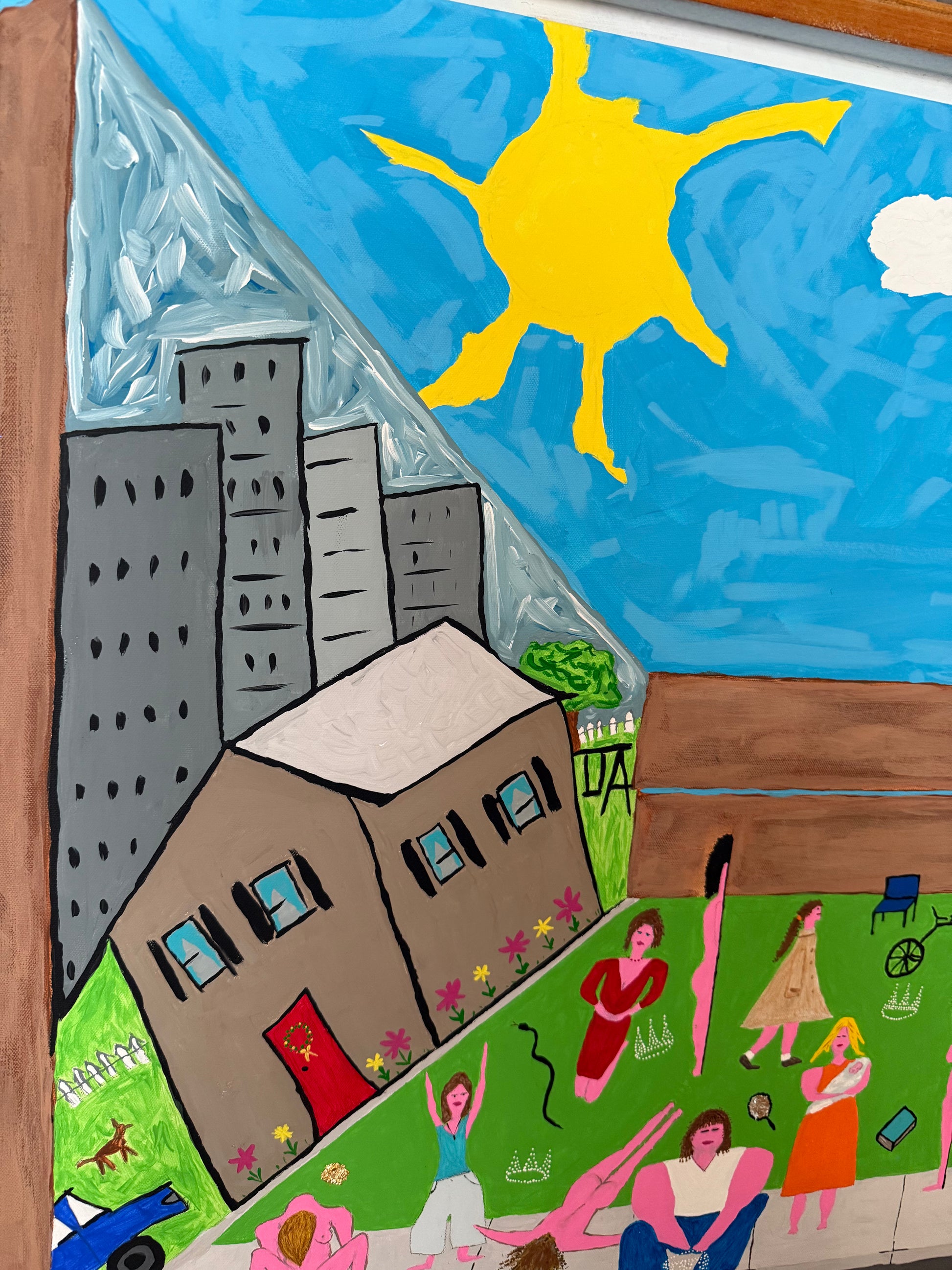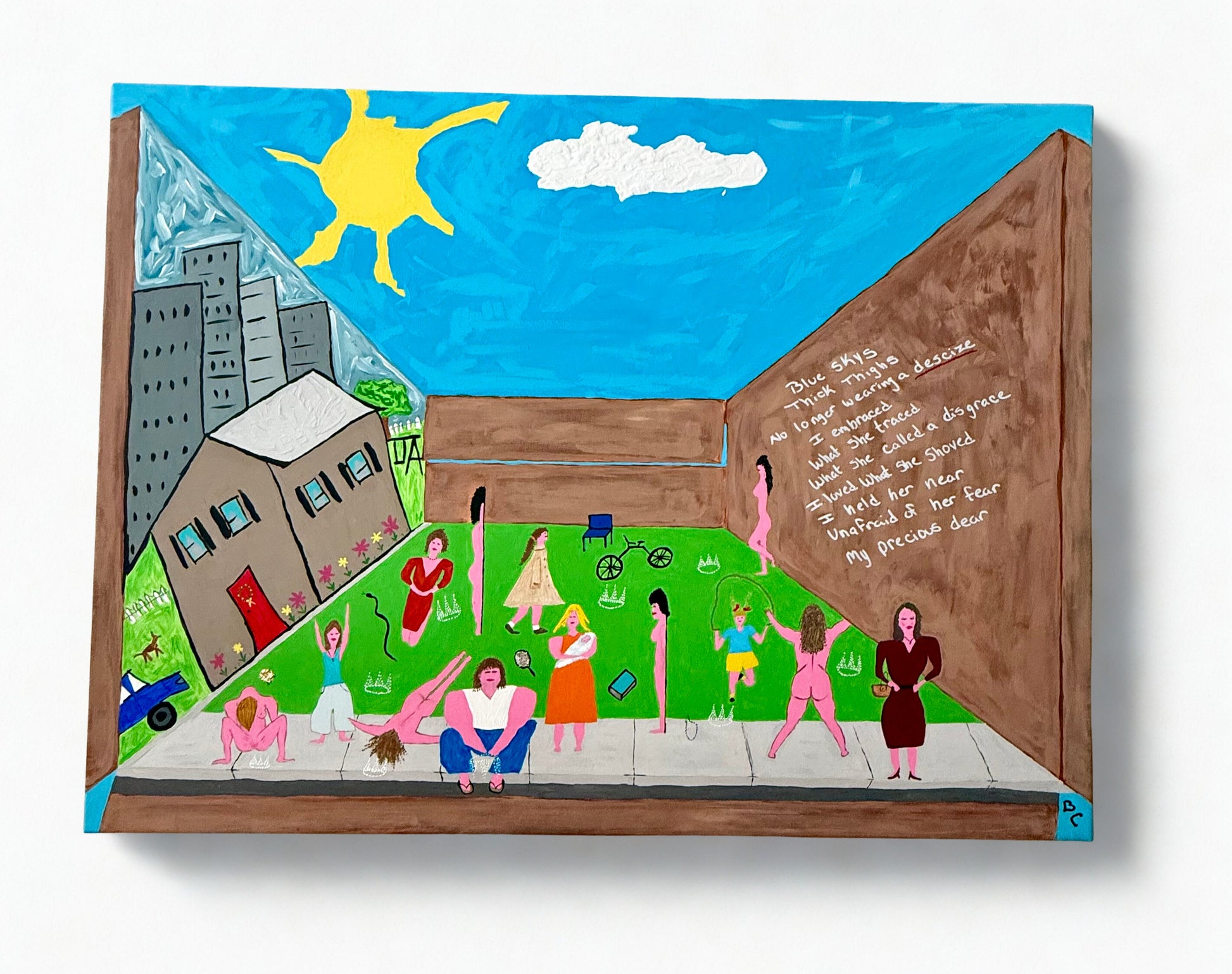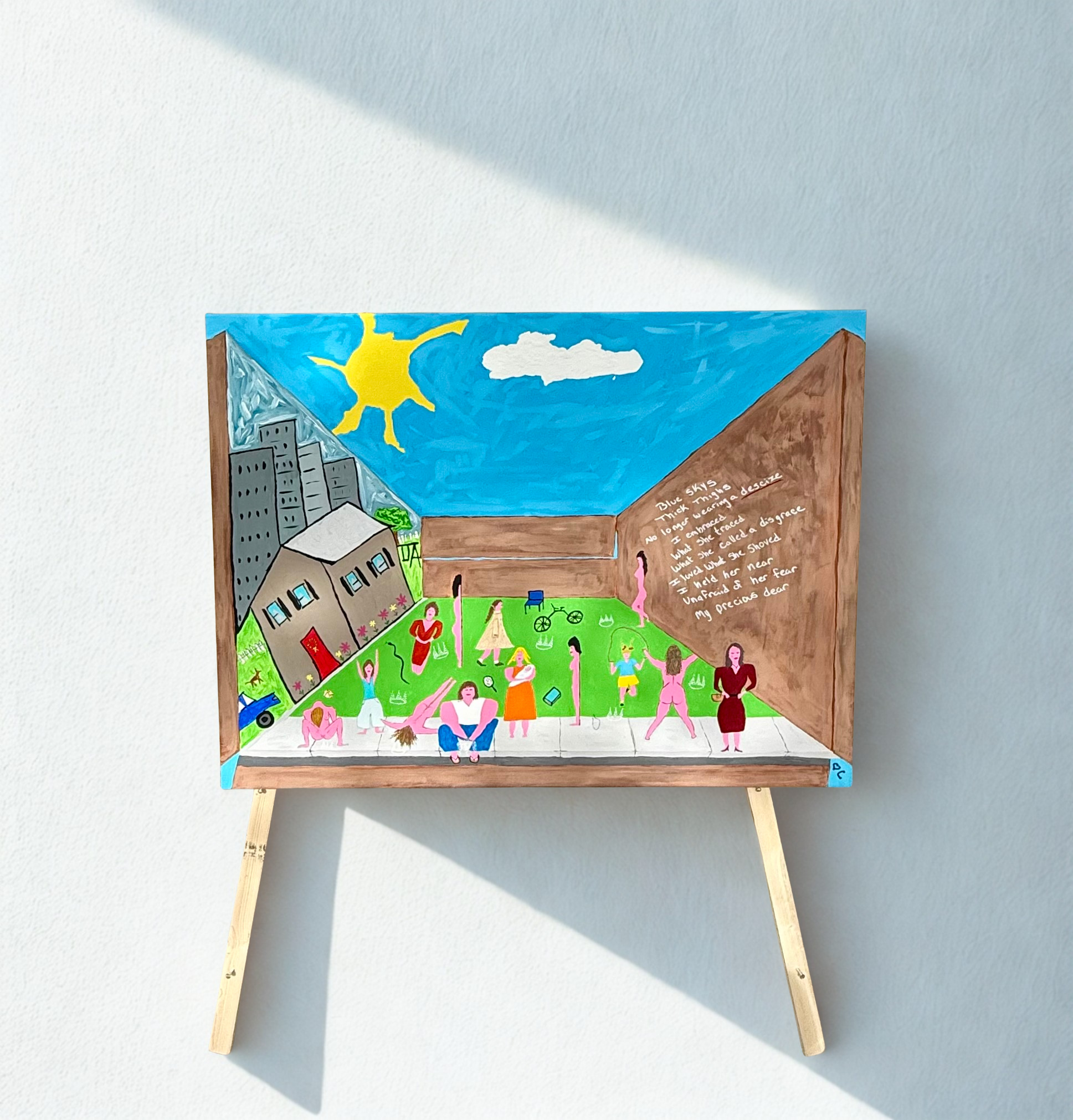 30x40 in acrylic painting. A surreal street-scene unfolds inside an open box where every woman represents a former self. Through symbols, crowns, and a handwritten poem, the piece explores shame, reclamation, and the moment she finally loves every version of herself.