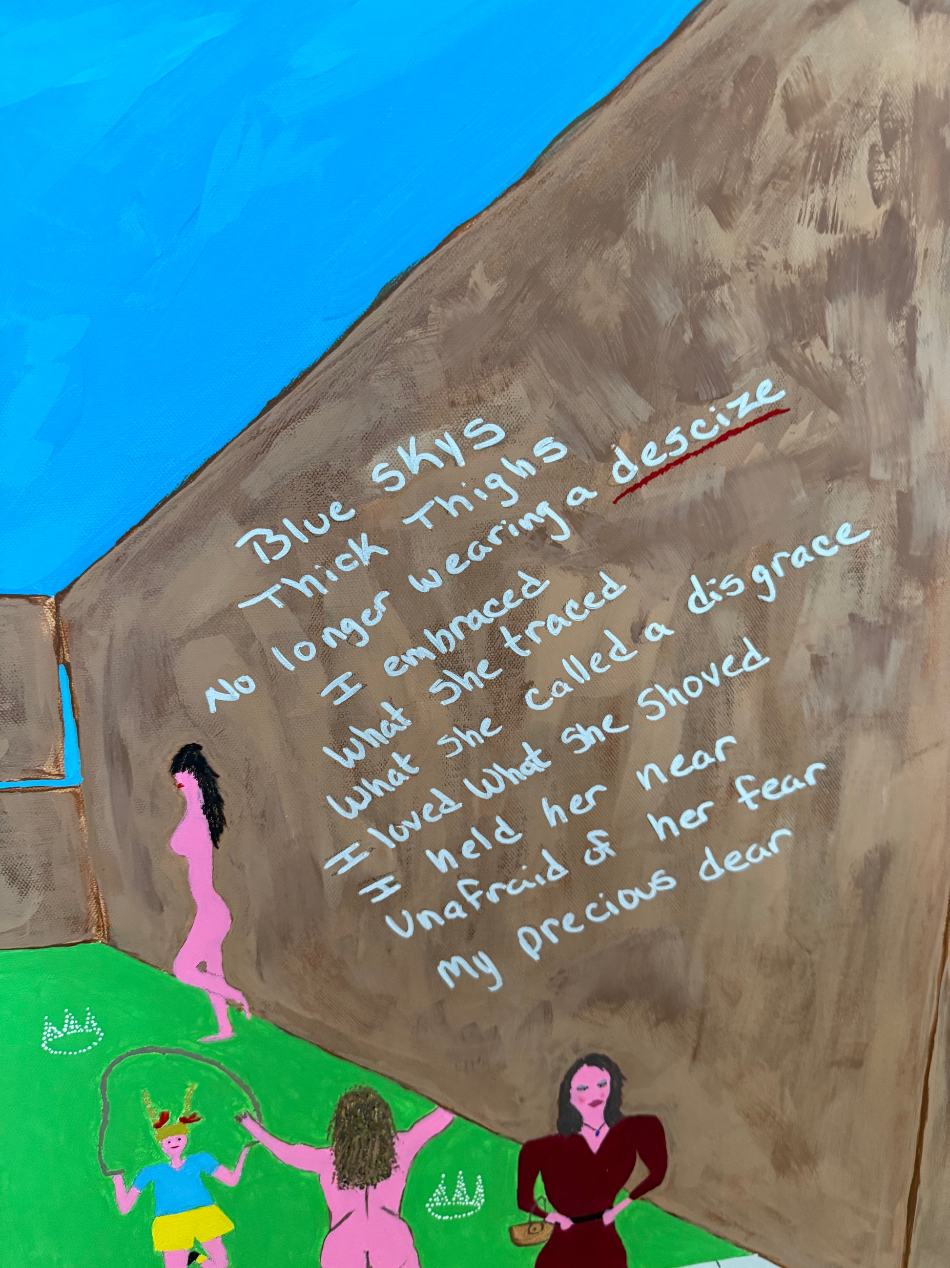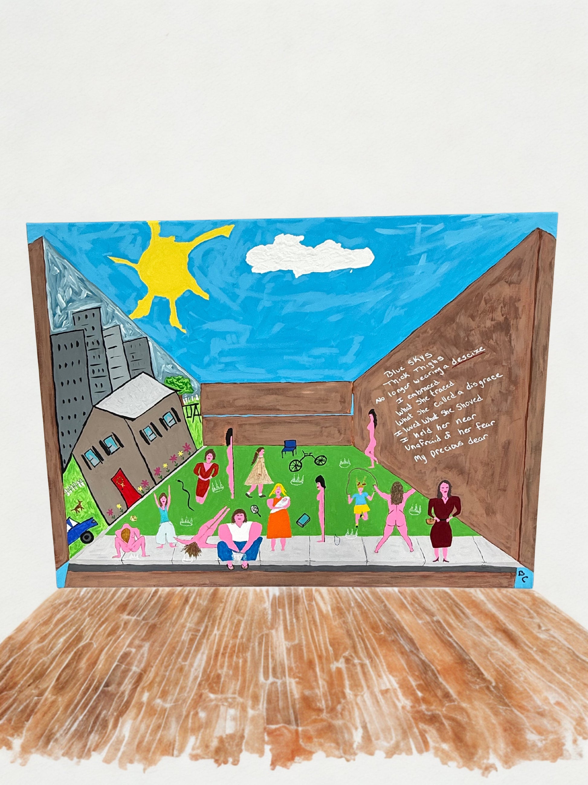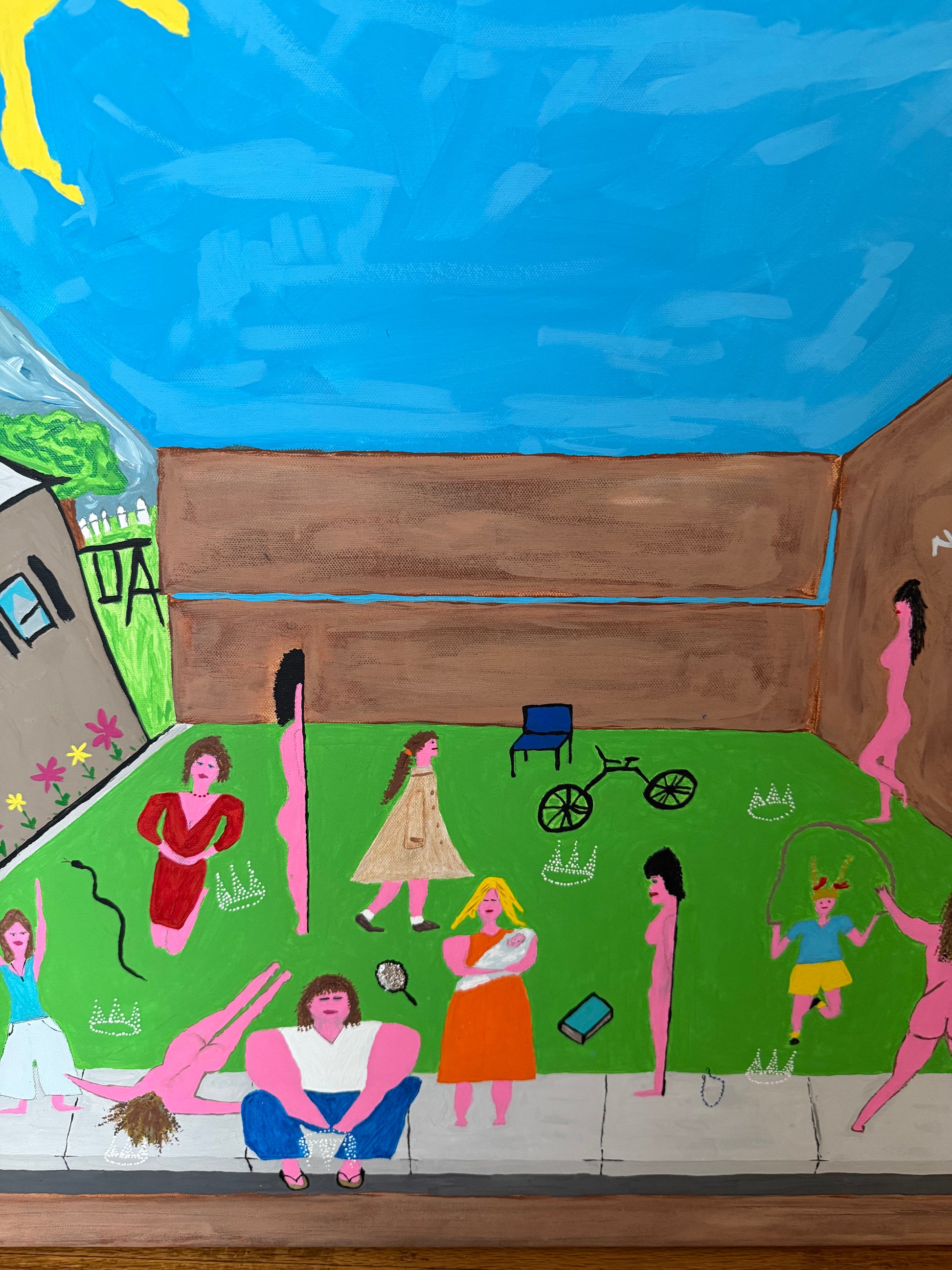 30x40 in acrylic painting. A surreal street-scene unfolds inside an open box where every woman represents a former self. Through symbols, crowns, and a handwritten poem, the piece explores shame, reclamation, and the moment she finally loves every version of herself.