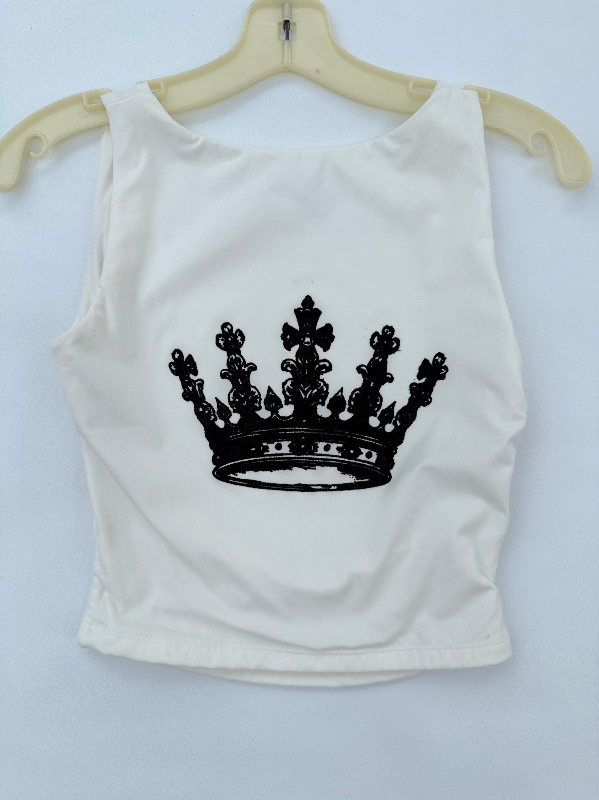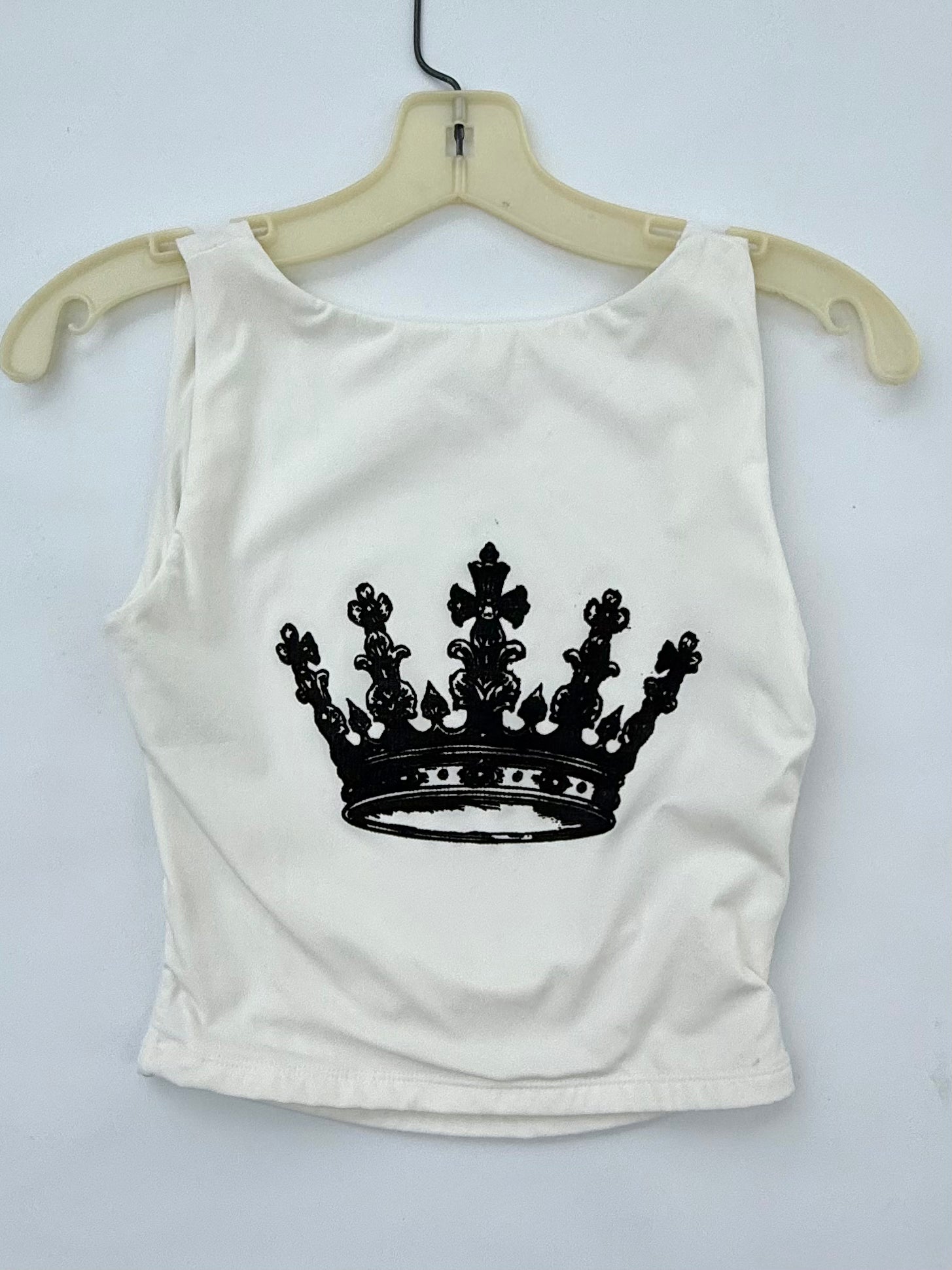 Elevate your look with this sleek white tank from the Crown Collection, designed to make a statement with both simplicity and strength. Crafted from soft, lightweight polyester, this women’s small backless tank top features a bold black crown screen print on the front — a symbol of confidence and power.