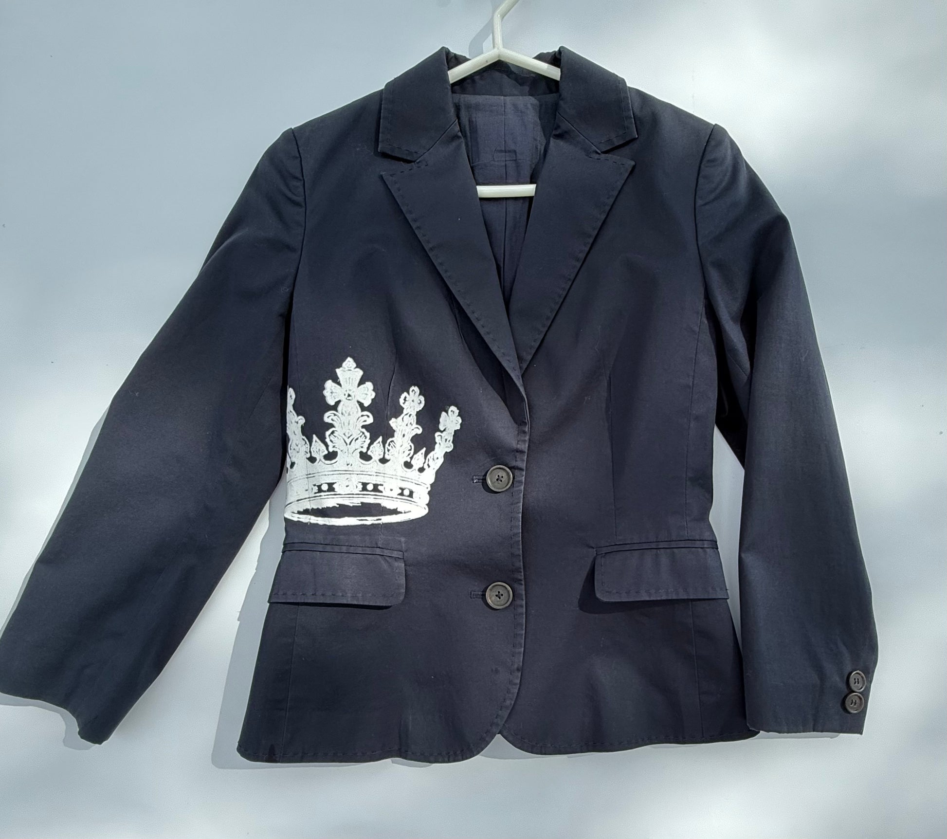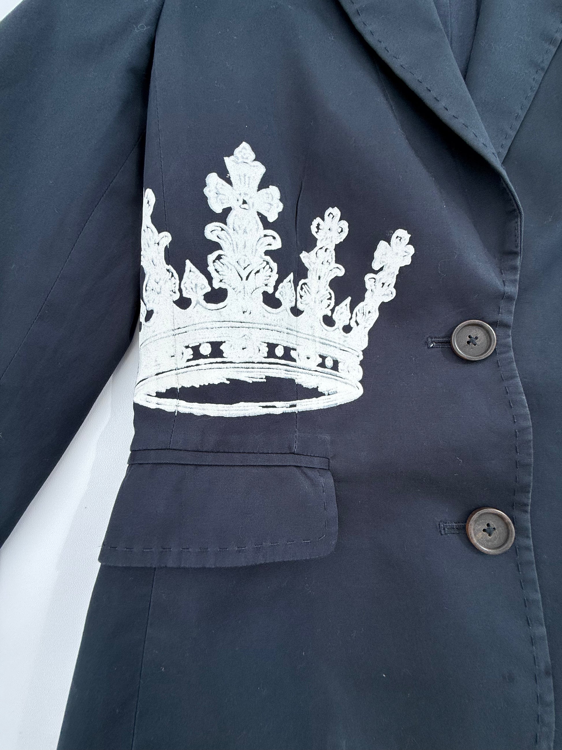 - Details: White crown screen print on front, notched lapels, two-button closure, flap pockets, button cuffs