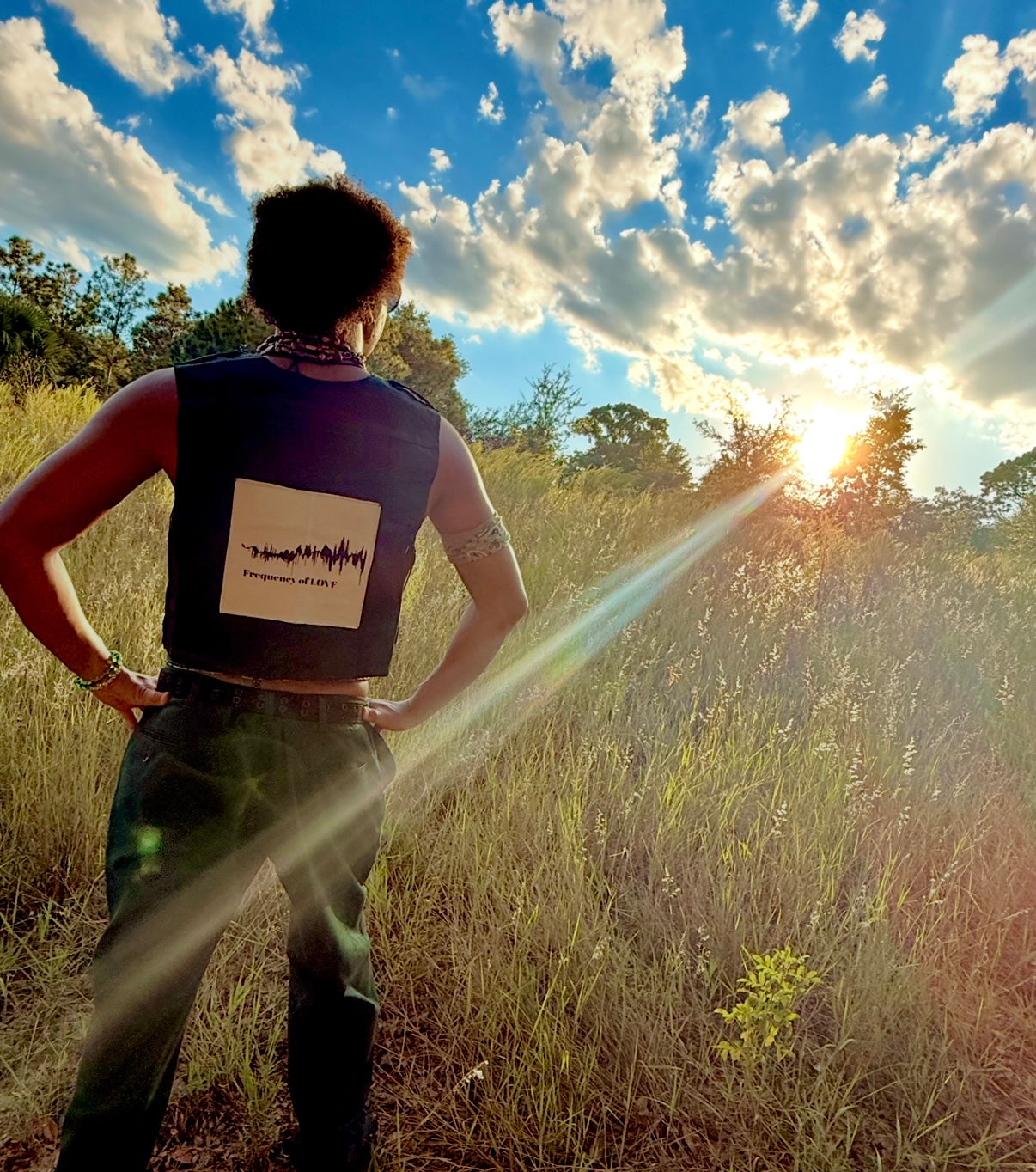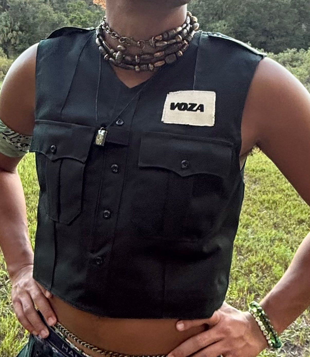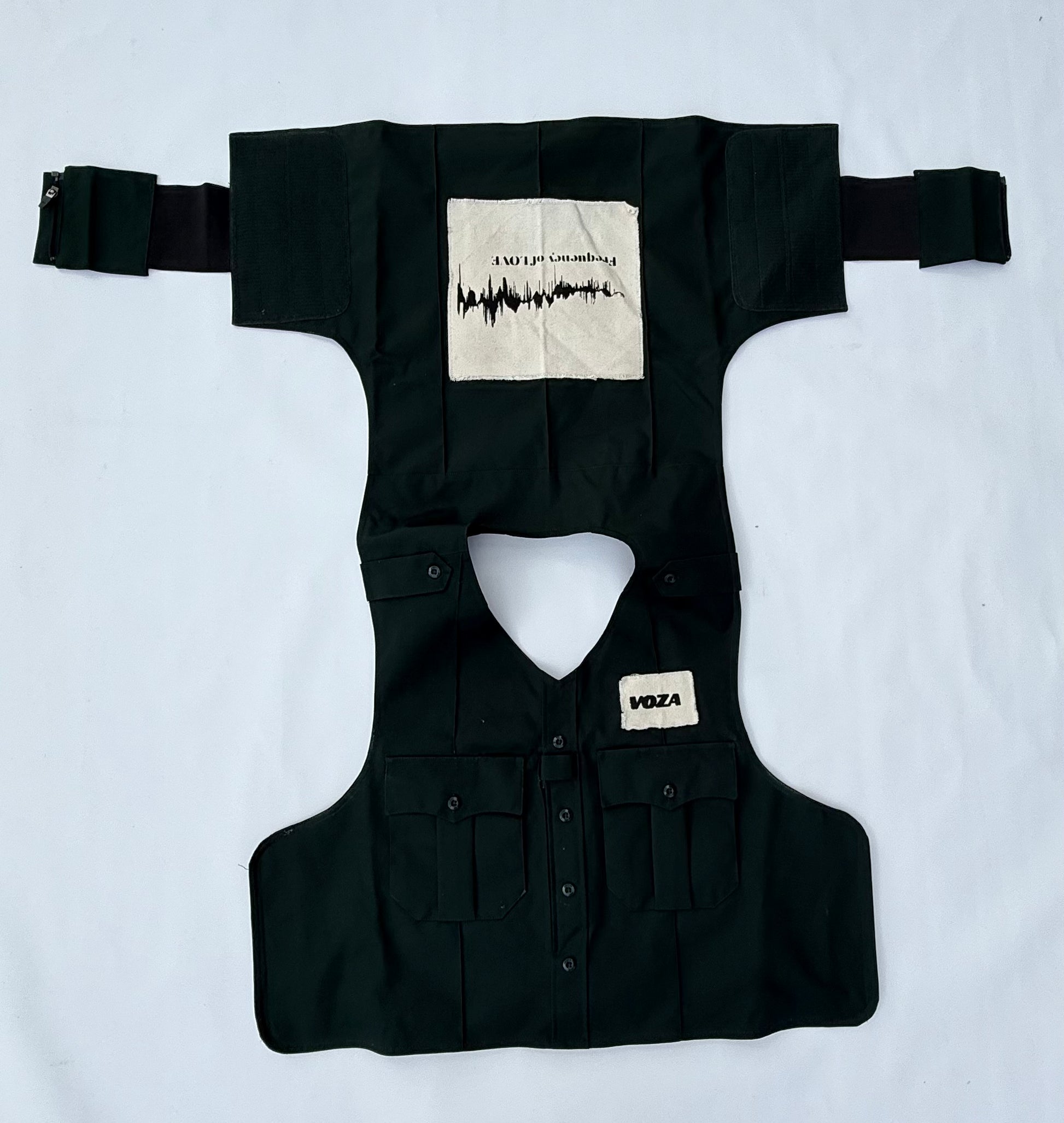 The front features a VOZA patch, while the back is adorned with a bold canvas panel printed with the Frequency of Love soundwave. More than clothing, this vest is wearable art—merging utilitarian toughness with expressive design.