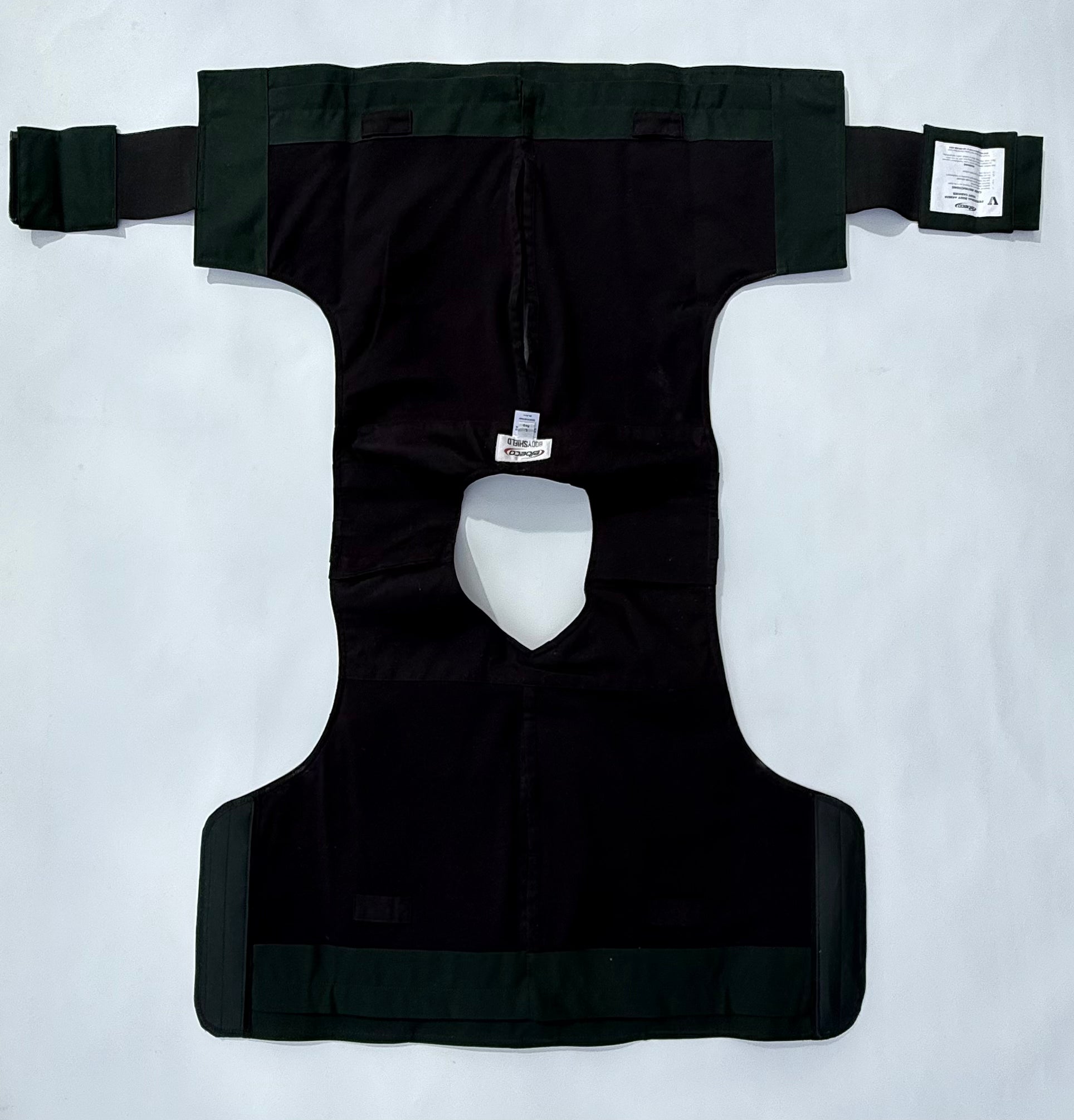A one-of-a-kind piece that blurs the line between function and art. This forest green vest from the Frequency of Love Collection is reworked from an authentic bulletproof vest shell, with the protective sheets removed. It retains its original construction—complete with interior zip and Velcro closures, adjustable side panels, and slots designed for ballistic plates—yet now serves as a powerful fashion statement.