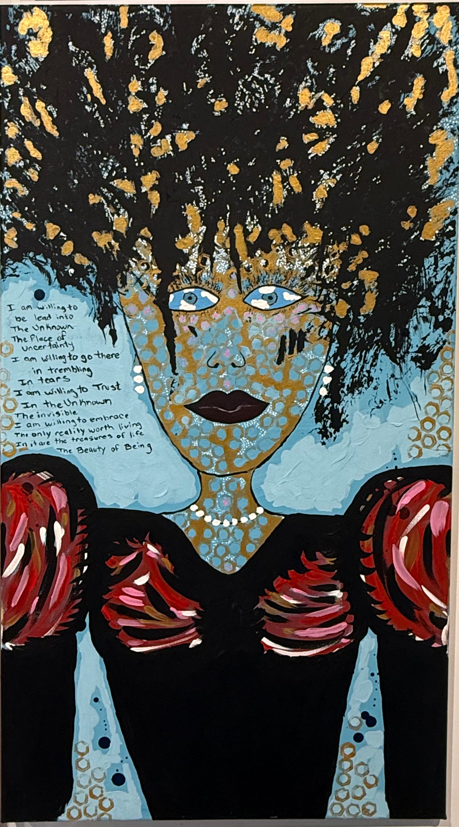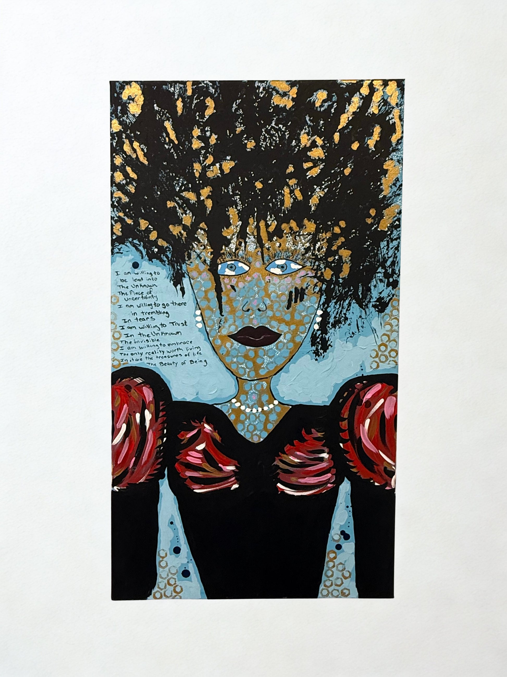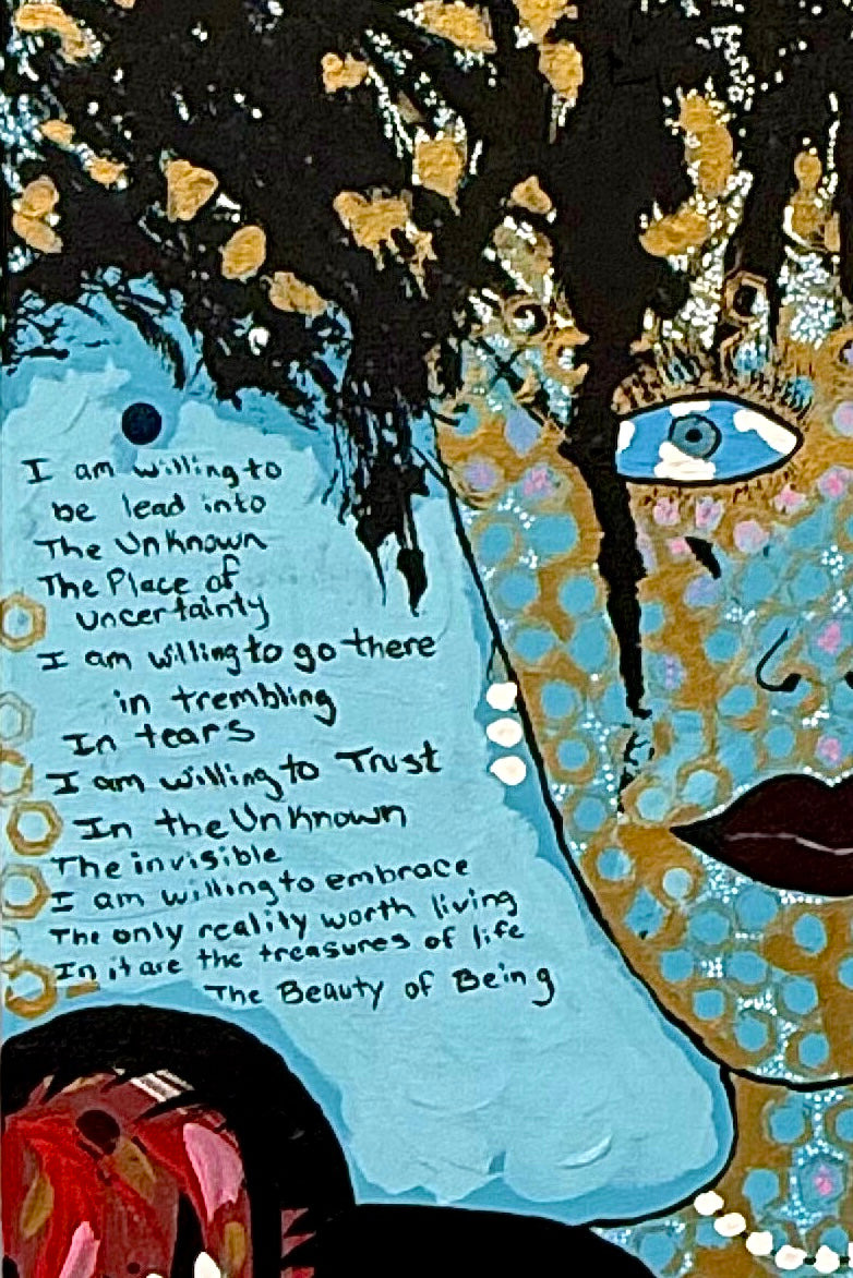 Embedded within the painting is a handwritten poem, partially concealed within the layers. The text speaks to willingness—to enter the unknown, to trust without guarantees, to embrace uncertainty not as failure, but as a sacred passage. The poem is not meant to be fully decoded at first glance; it reveals itself slowly, much like the becoming it describes.
