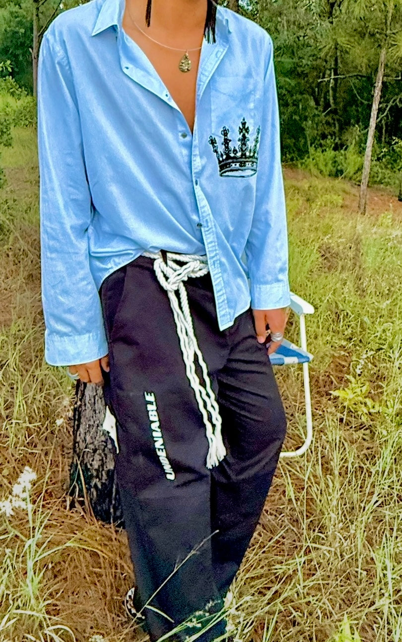Built for versatility and presence, these oversized black utility pants from the Undeniable Collection deliver both durability and streetwear edge. Featuring a relaxed fit with reinforced utility-style stitching, they’re made to be worn loose for a bold oversized silhouette—or cinched with a belt for a sharper, tapered look. The front leg is marked with the word UNDENIABLE, while the back carries a subtle VOZA detail, grounding the piece in signature identity. A true balance of function and statement style.