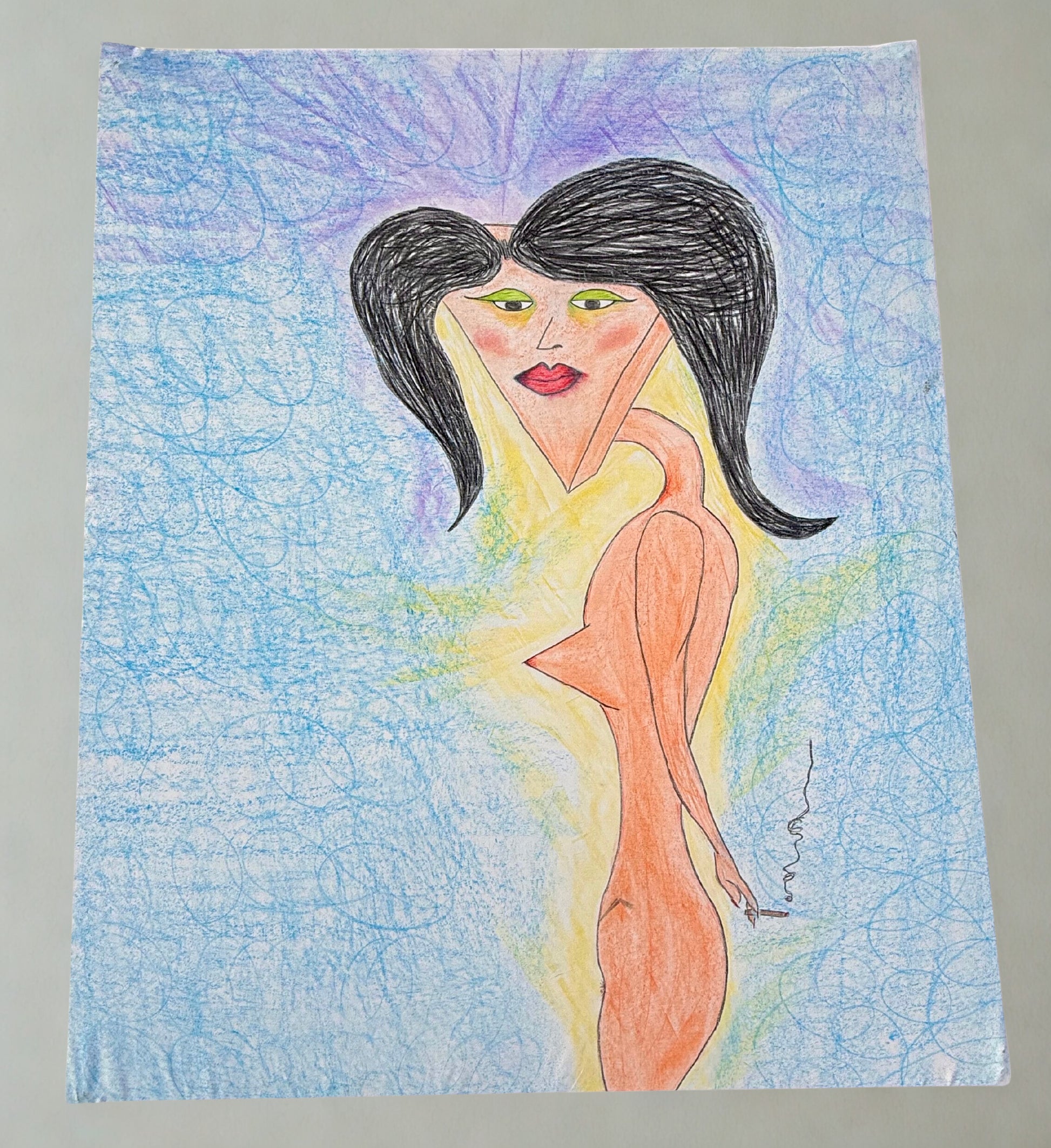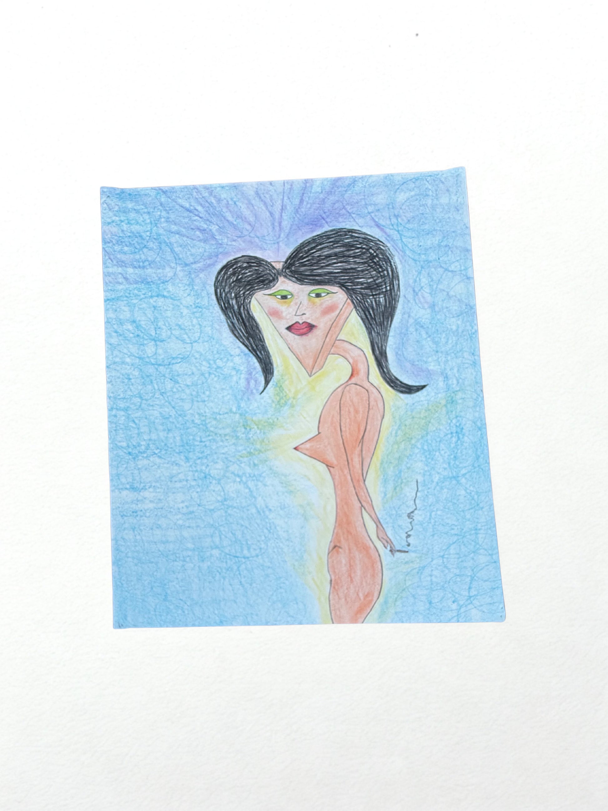 The triangular geometry of the face contrasts with the fluid, elongated body, suggesting the tension between structure and flow, mind and instinct. Cool blues surround the figure like an emotional field, while warm tones trace the body—hinting at vulnerability, desire, and embodiment. The crayon marks remain visible and intentional, honoring the process rather than polishing it away.