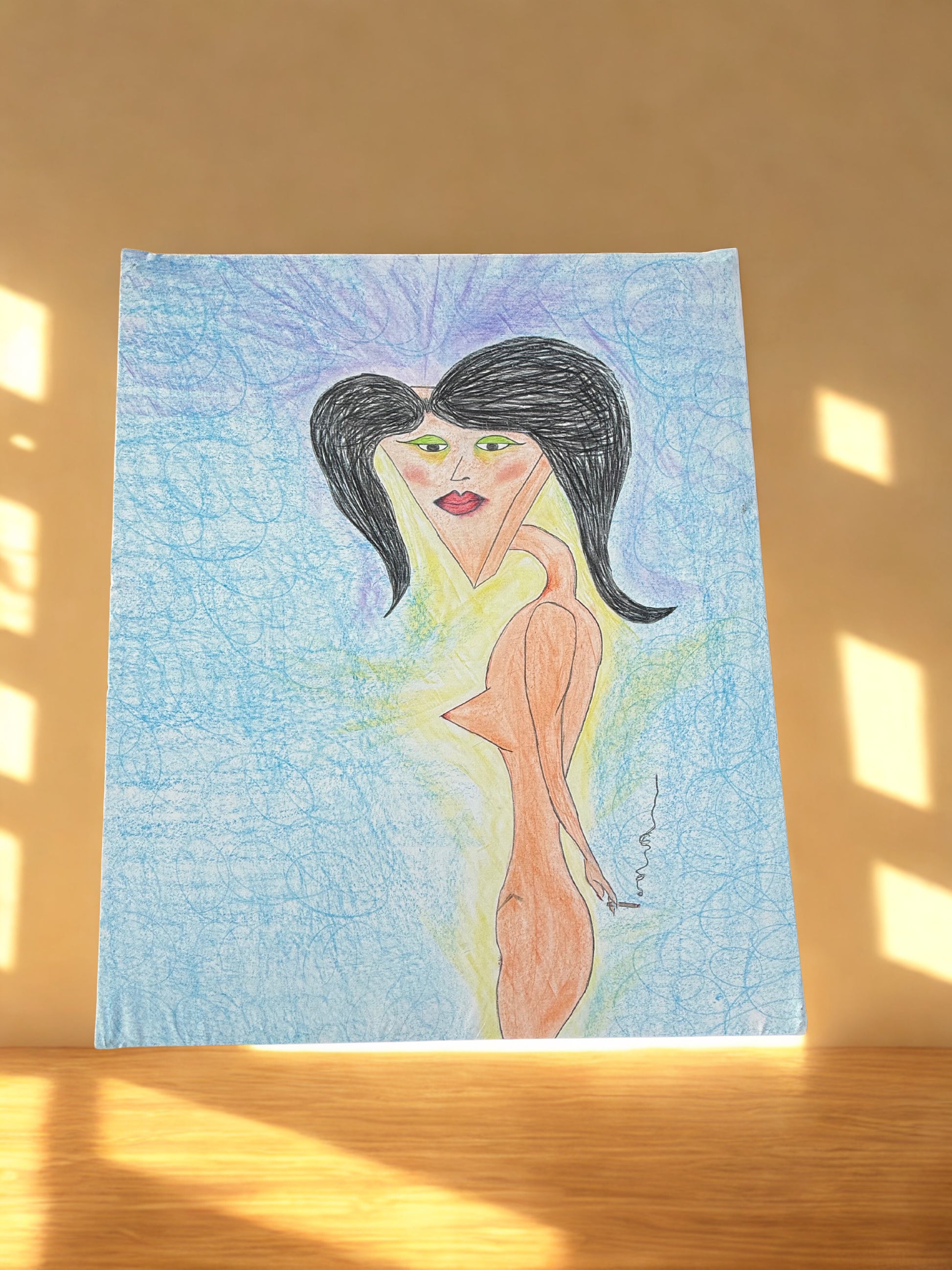 Try Angle is a study in perspective, softness, and courage—the willingness to be seen from an unconventional angle. Rendered in block crayon on canvas, this piece carries a childlike honesty paired with a quietly provocative feminine presence. The figure emerges through asymmetry and color, not asking for perfection, only attention.