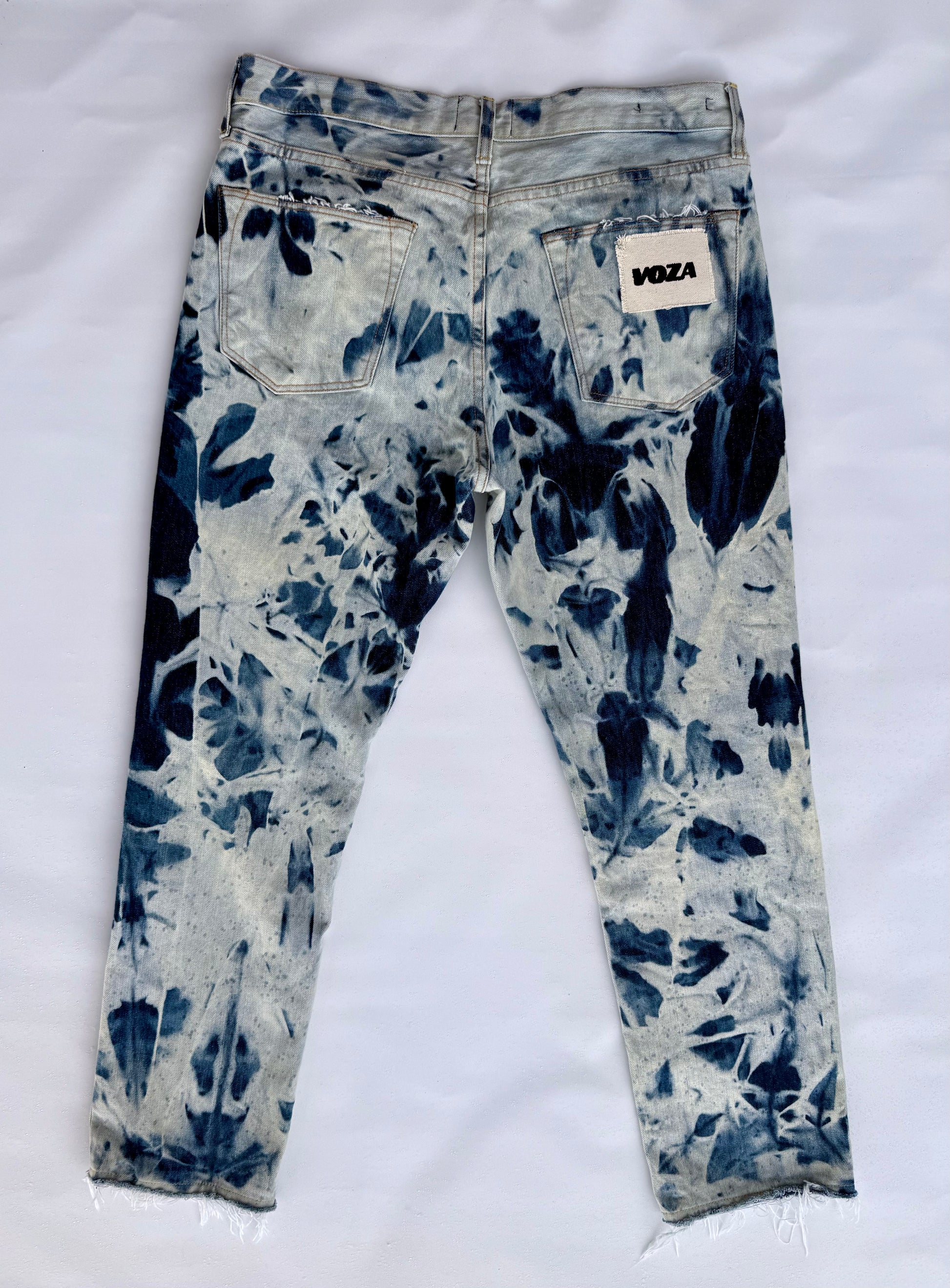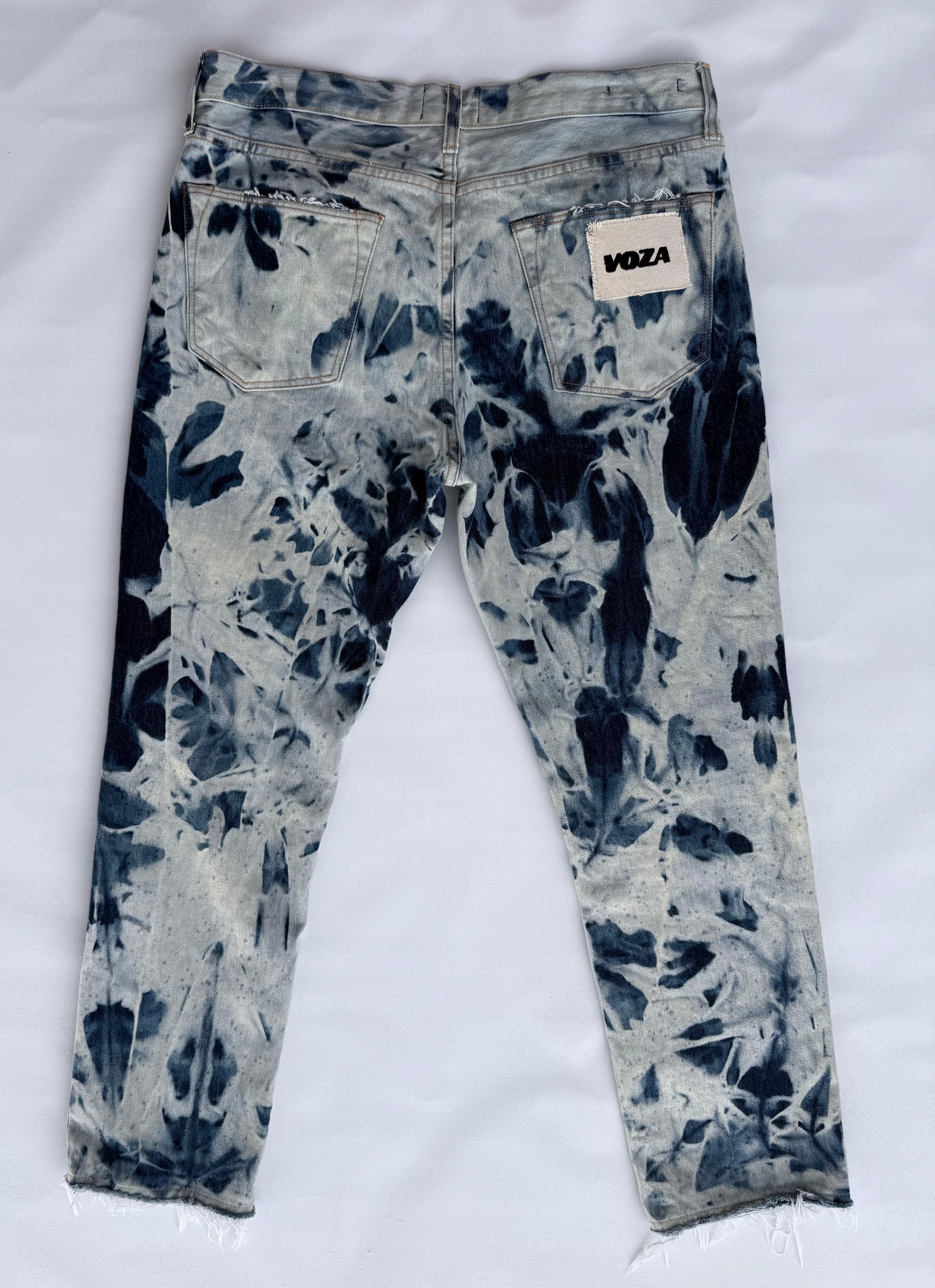 These reworked Voza jeans are pure street-style energy. Hand-bleached and distressed, every mark and fade tells its own story—making this pair completely unique and impossible to duplicate.