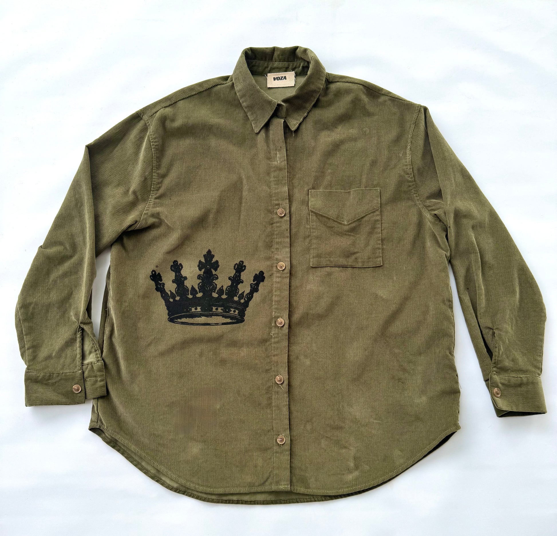 From Voza’s Crown Collection, this forest green corduroy shirt blends rugged texture with regal expression. Reworked into a one-of-a-kind statement piece, it features a bold black crown graphic stamped across the front—symbolizing strength, confidence, and individuality.