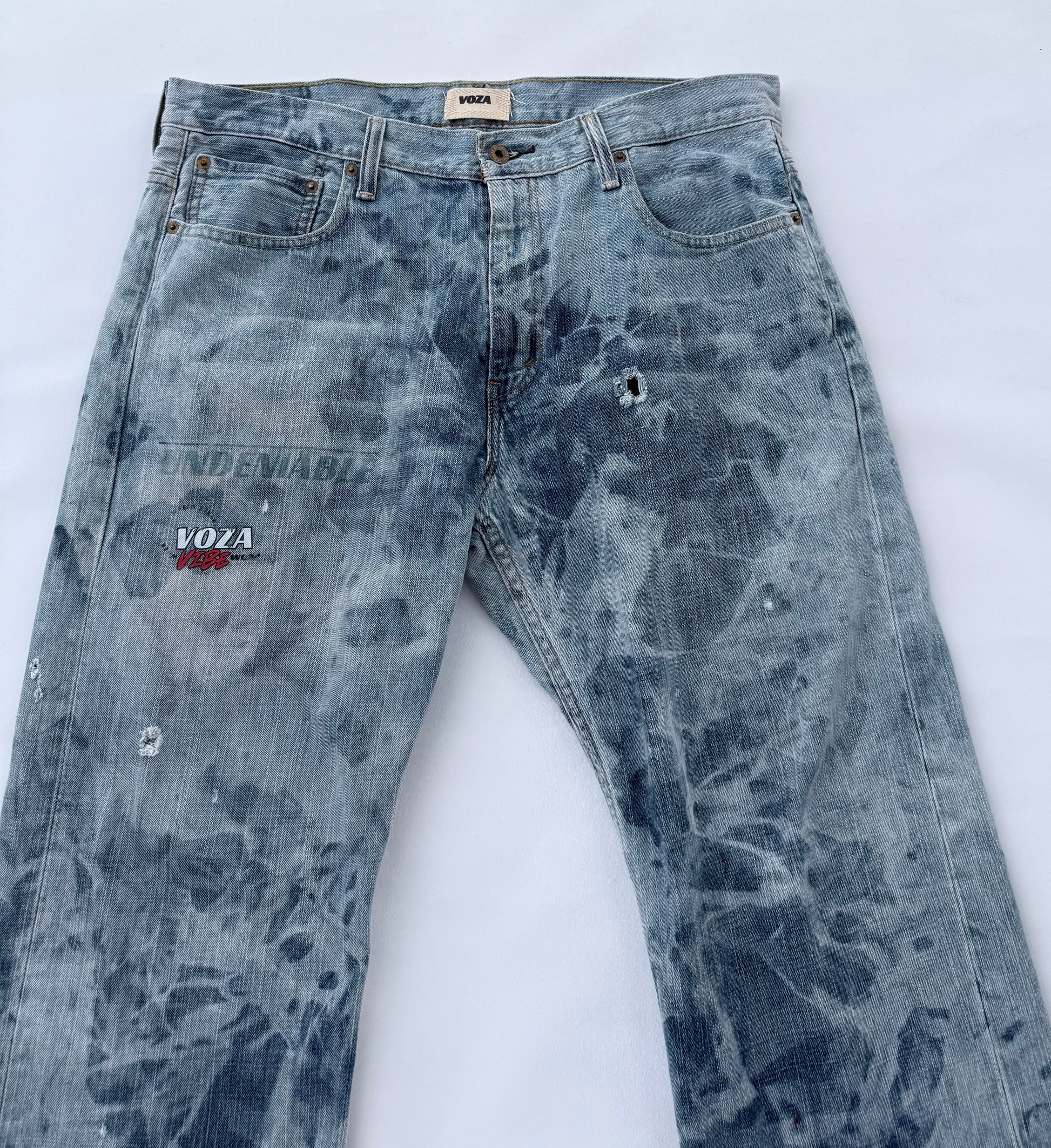 On the front, you’ll find the faded stencil “UNDENIABLE” alongside the Voza Vibes logo, anchoring the design in strength and authenticity. The natural distressing and bleach work across the legs give each pair a textured, lived-in character that can’t be duplicated.