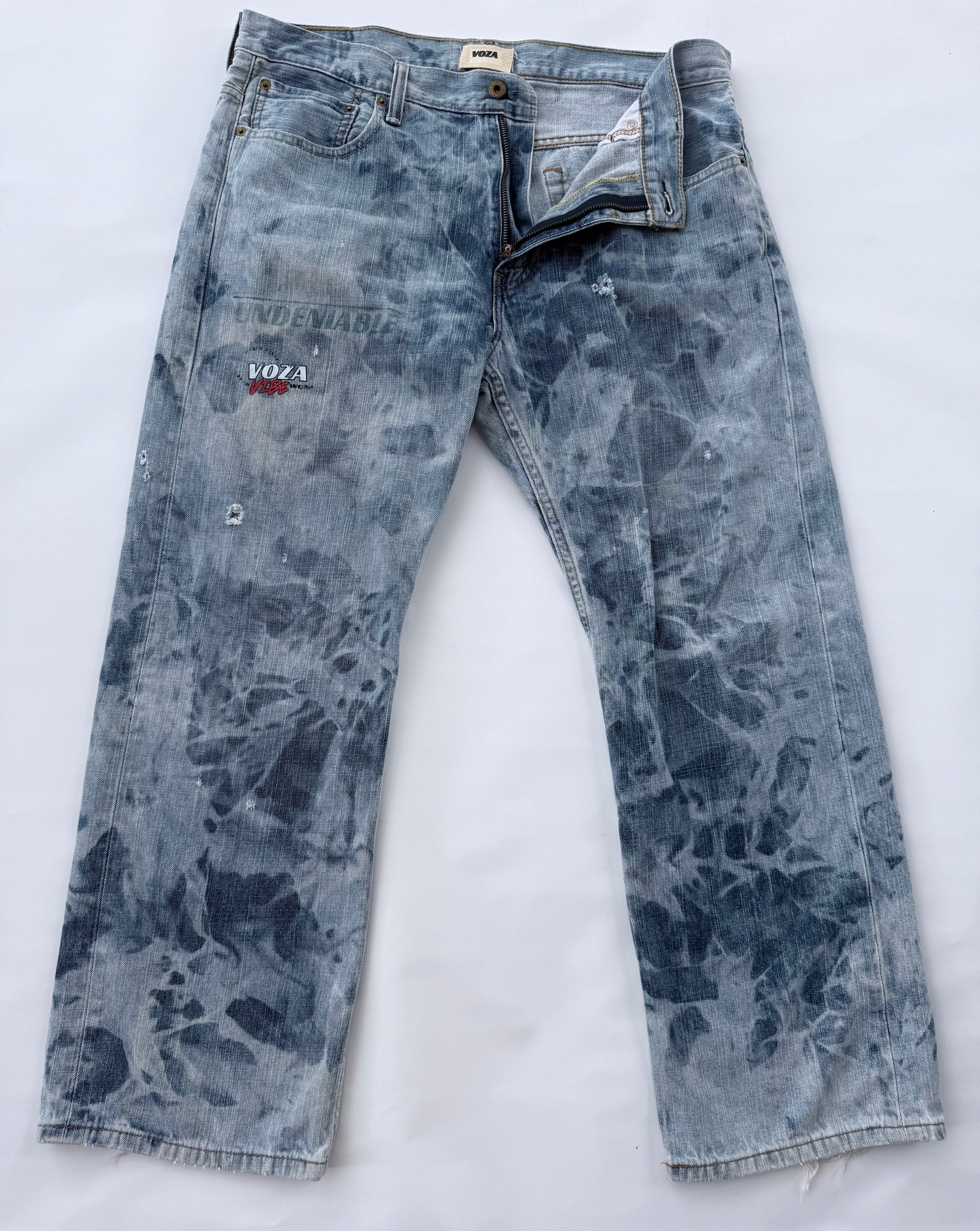 These reworked Voza jeans are a bold fusion of grit and street artistry. Originally Levi’s denim, they’ve been transformed with hand-bleached patterns, subtle distressing, and signature Voza details—making them a one-of-one statement piece.